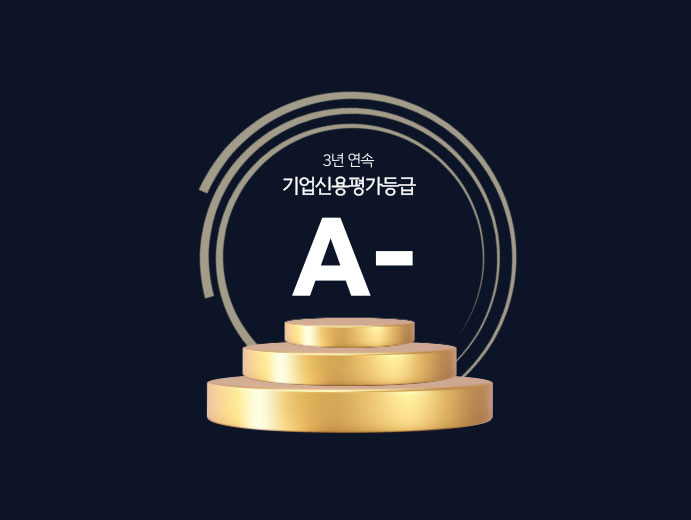 동종업계 최상위 등급 A- 획득. 정림건축으로부터 분리한 이후, 정림씨엠은 독자적으로 기업신용평가 등급인 A-를 획득했습니다. 이후 3년간 안정적인 경영성과와 재무 건전성을 바탕으로 동일 등급을 꾸준히 유지해왔습니다. 앞으로도 신뢰받는 파트너로서 지속 가능한 성장을 이어가겠습니다.