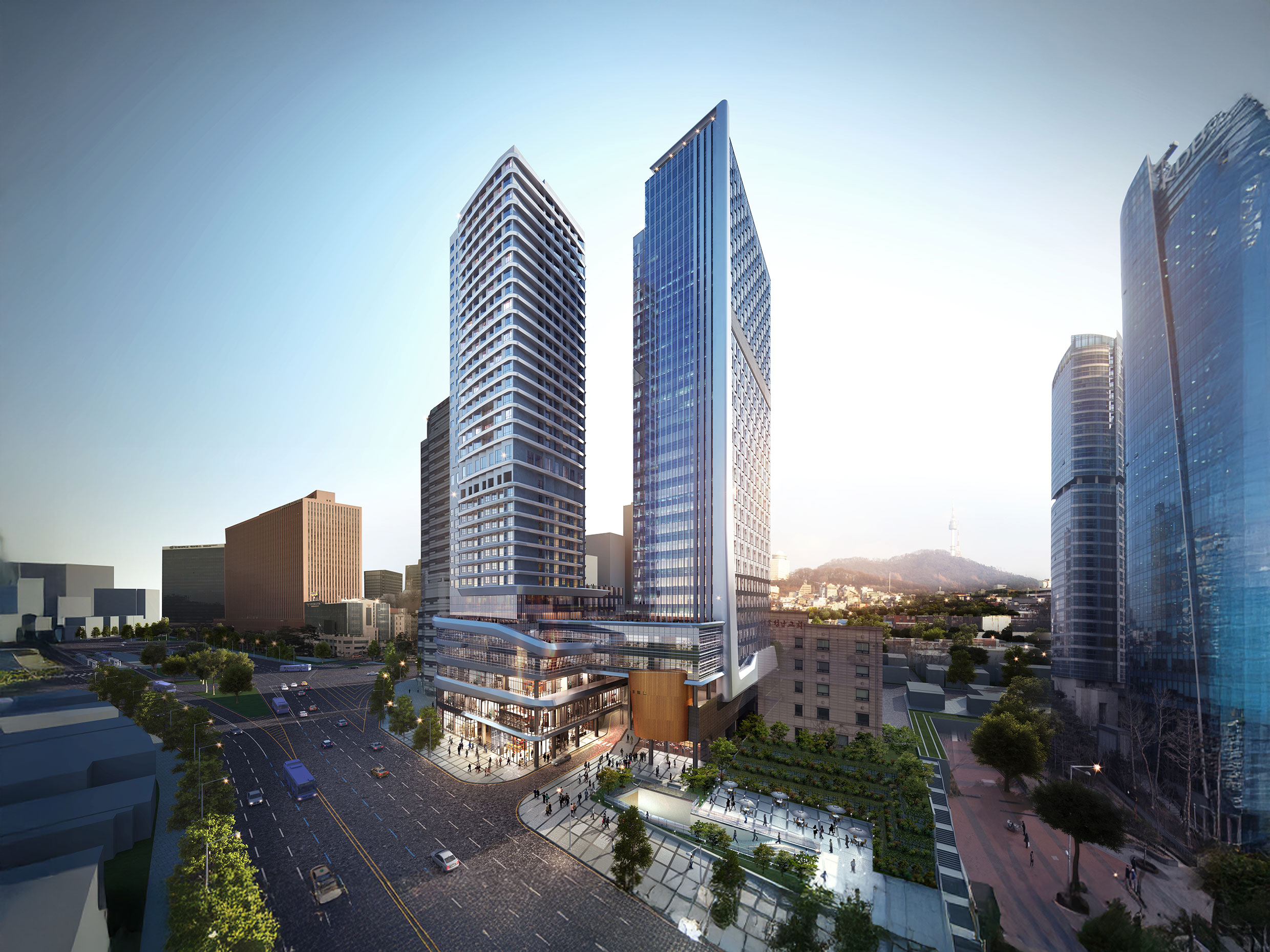 대지의 단차를 활용해 용도별로 진입 동선을 명확히 구분하였고, 대지 내 보행통로를 계획하여 건물로 인해 단절될 수 있는 한강대로변과 후암로를 적극적으로 연결했다. 저층부에는 가로활성화 목적으로 판매시설을 배치하고, 고층부는 가족호텔과 공동주택, 비즈니스호텔과 업무시설로 계획했다. 또한 부대시설은 타 용도와의 독립성을 유지하면서도 입주민도 이용할 수 있도록 하여 편의를 도모했다.