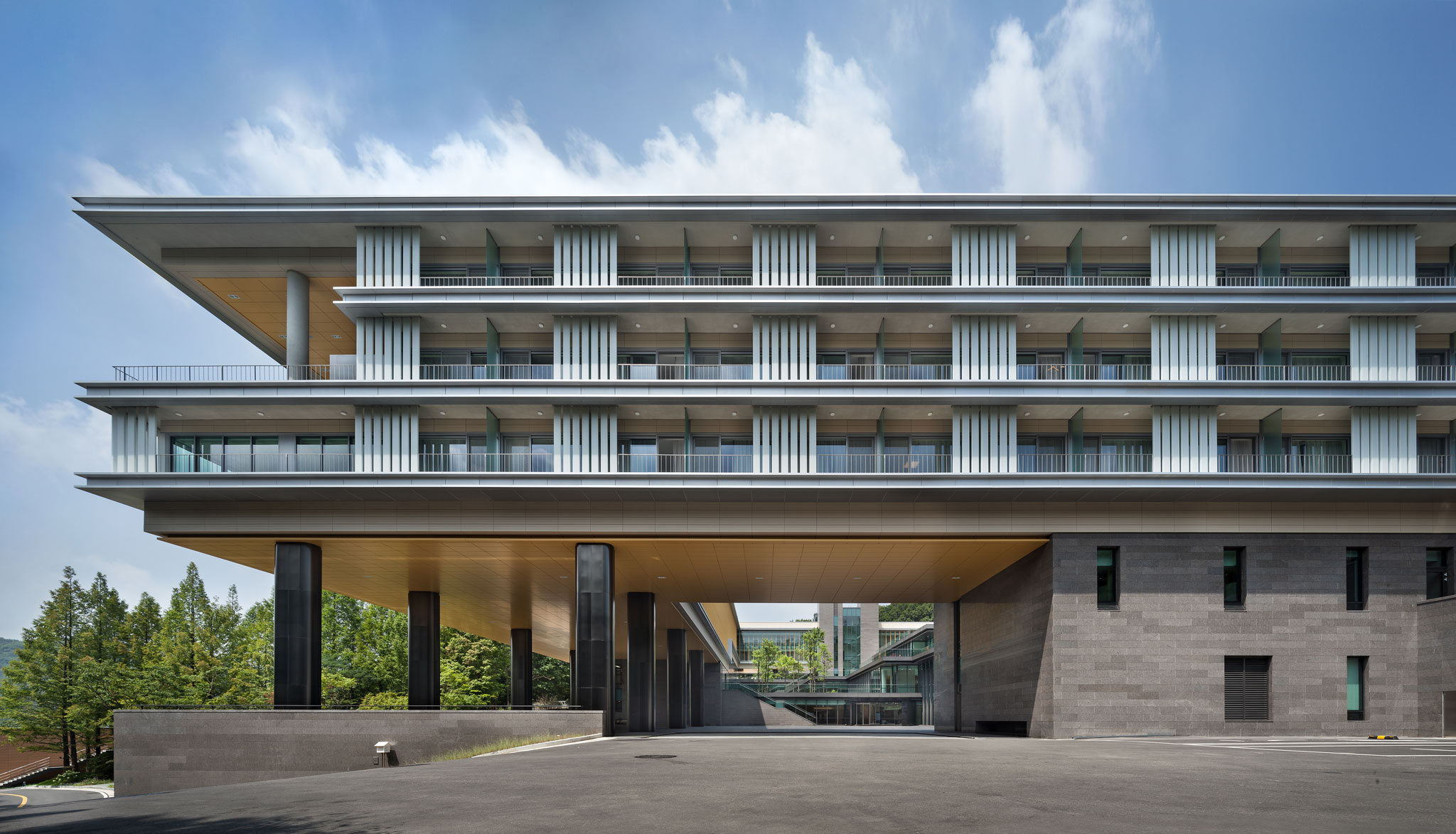 내부는 교육실 사이로 중정을 배치하여 채광과 환기를 유도하여 쾌적한 학습 환경을 조성했다. 복도와 로비 등의 내부 공용 공간을 중정과 맞닿도록 계획하여 실내가 더 넓어 보이도록 했고, 모든 지하 외벽에 복도 형식의 DA(Dry Area)를 설치하여 지하층에서 발생하는 습기를 원천적으로 차단했다. 기존 지형은 15m의 단차가 있는 땅이었지만, 이를 부지의 고유한 특징으로 해석하여 식당, 대강당, 체육관, 숙소 등 연수시설이 가져야 할 다양한 프로그램을 조닝하는 데 효과적으로 활용했다.