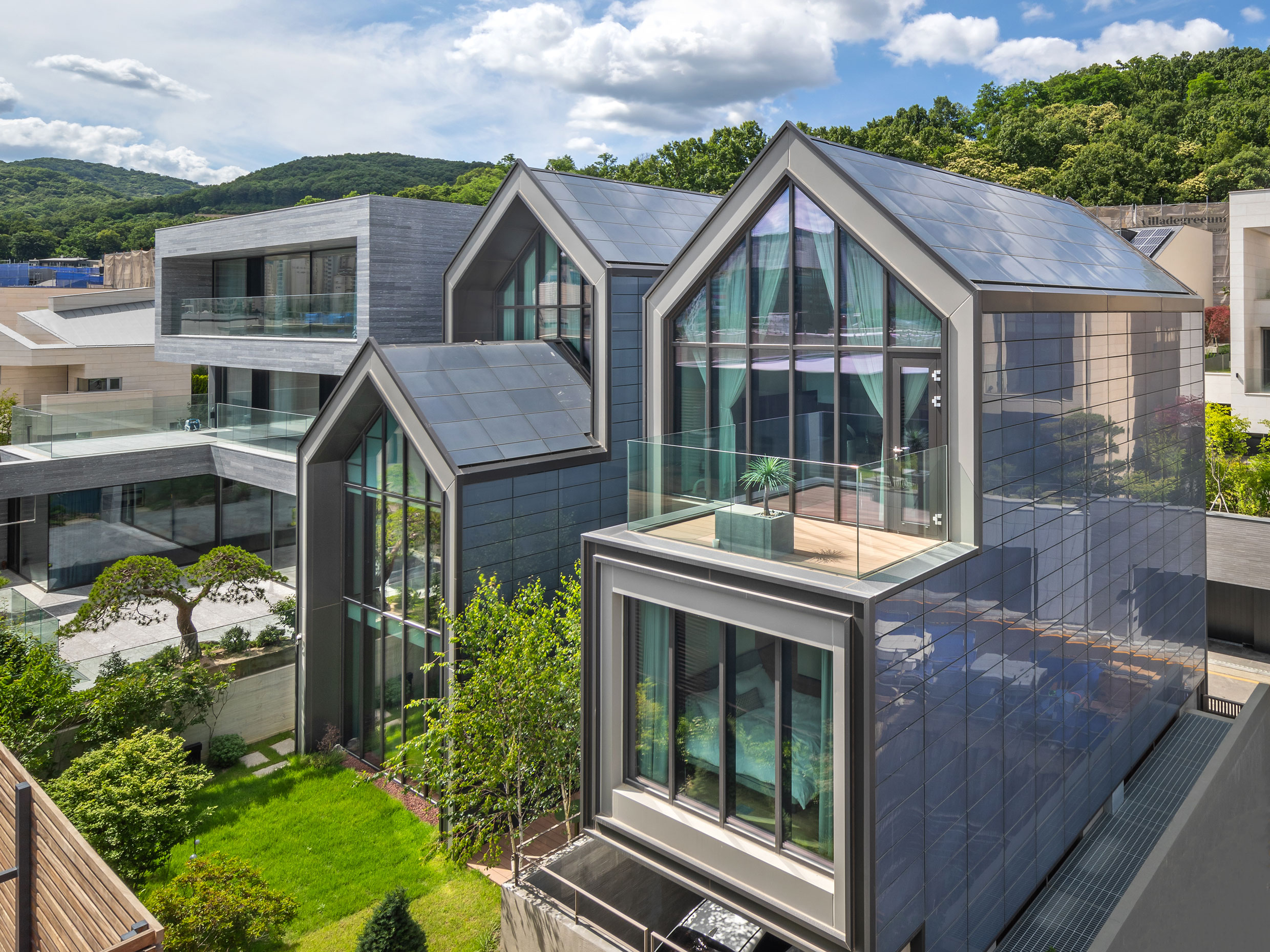 단독주택 용도와 디자인 특성에 따라 넓은 외피면적과 창면적에서 소요되는 에너지량을 최소화하기 위한 전략들이 수립됐다. 먼저 북측 창면적을 최소화하는 한편 공간의 용적을 최소화했으며 단열과 열교 방지, 팽창밴드를 적용한 로이삼중창호 등으로 제로에너지하우스(ZEH)에 걸맞는 패시브 성능을 달성했다. 또한 입면과 지붕에 설치한 약 880매의 BIPV 모듈은 LG전자와 정림건축이 자체 개발한 것으로, 외장재로도 손색없는 미려함과 설치 디테일을 갖추고 있다. LG전자는 이곳에 자사가 보유한 홈 어플라이언스 기술과 IoT 기술을 접목시킨 미래 주거를 기획하고 있다. LG ThinQ Home은 향후 일정 기간 LG의 레퍼런스 주택으로 활용될 예정이며, 에너지 자립률 100퍼센트의 제로에너지 주택으로 작동할 것이다.