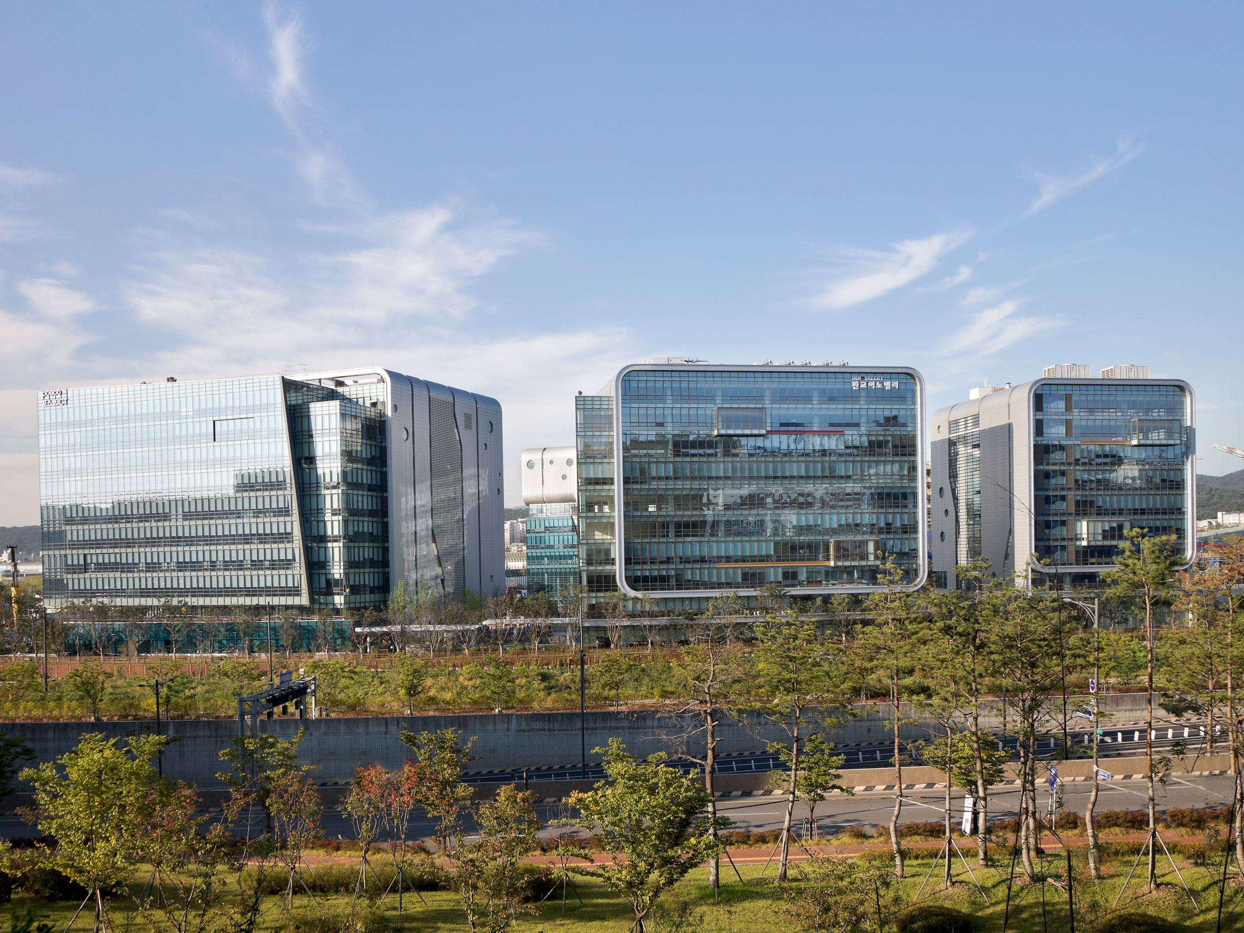 두 개 블록으로 구성된 필지는 앞뒤로 경부고속도로와 금토천이 지나고 있으며, 도시계획으로 마련된 체육공원이 두 블록을 연계하고 있다. 이에 건물동을 연결하는 공중브릿지를 6개층 높이로 들어올리고 그 아래 공간을 사용자들이 휴식할 수 있는 정원 개념으로 계획해, 단지 내부와 주변 체육공원을 잇는 커뮤니티 장소로 발전시켰다. 더불어 4개층으로 구성한 공중정원은 가운데 공간을 비우고 외부 조경과 연계해 이색적인 공간 경험을 유도했다. 도시 가로에 대응하는 커튼월 외피는 유리창과 금속재를 대비시키며 선의 흐름을 강조한다. 지붕까지 이어지는 수직 띠창과 원형 창은 디지털의 첨단 이미지를 형상화했고, 커튼월 곳곳에 배치한 유리박스로 외관에 리듬감을 부여했다.