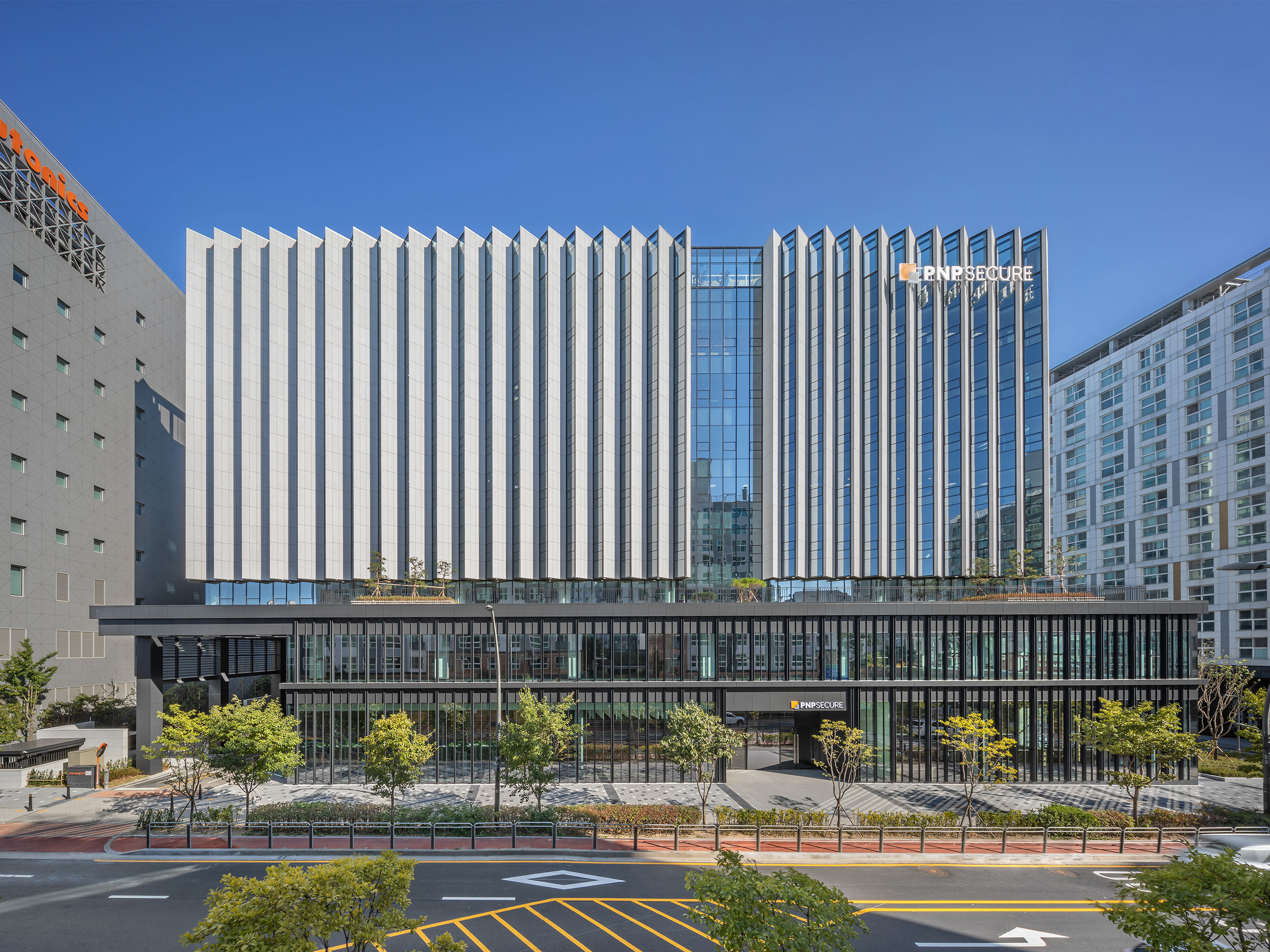 저층부 포디움에는 로비, 커뮤니티 홀, 휴게공간 등 다목적 부대시설을 배치해 재실자의 쾌적한 환경 이용을 돕고 공공 가로의 열린 공간과 마주한다. 검은빛의 수평 알루미늄 복합패널과 멀리언 캡을 이용한 디자인 계획은 실내에도 연장되며 콘셉트를 일관성 있게 연결한다. 상층부는 연구 및 업무 공간들로, 무주 공간을 구현하고자 고하중 장스팬 건물에 유리한 구조 및 공법을 채택했다. 근무 편의를 위해 북향으로 창을 내 햇빛을 조절하면서 바깥으로 어린이공원과 연결녹지가 내다보이는 조망을 확보했다. 수직 패턴의 입면은 일정한 향과 각도로 여닫을 수 있도록 디자인된 것이다. 이에 주변 시설과의 상호 프라이버시를 지키면서 도시에 다양한 표정을 연출한다.