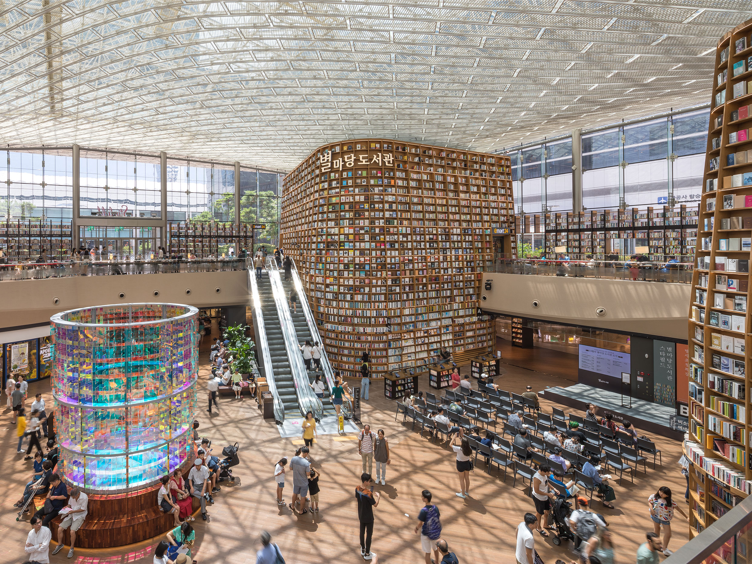 스타필드 코엑스몰 내에 위치한 별마당 도서관은 새로운 쇼핑 트렌드를 이끌고자 했던 건축주의 니즈와 기존 스타필드 건축물을 디자인해 온 정림건축의 노하우가 접목된 결과물이다. 정림건축은 ‘쇼핑과 문화의 접목’이라는 개념 하에 책과 문화, 예술이 어우러진 공간을 조성하여 쇼핑몰 이용객뿐만 아니라 주변 직장인과 지역 주민까지 이용 가능한 공간을 계획했다. 누구나 무료로 이용할 수 있는 열린 도서관으로, 코엑스몰에서 유일하게 층고가 높고 풍부한 자연채광이 유입되는 공간이다. 상징적인 13m 높이의 대형 서가 세 개는 여러 동선이 유입되는 코엑스몰의 중심부인 센트럴 플라자에 배치되어 상징성을 확보하면서도 이용객이 길 찾기(way finding)의 요소로 활용된다.