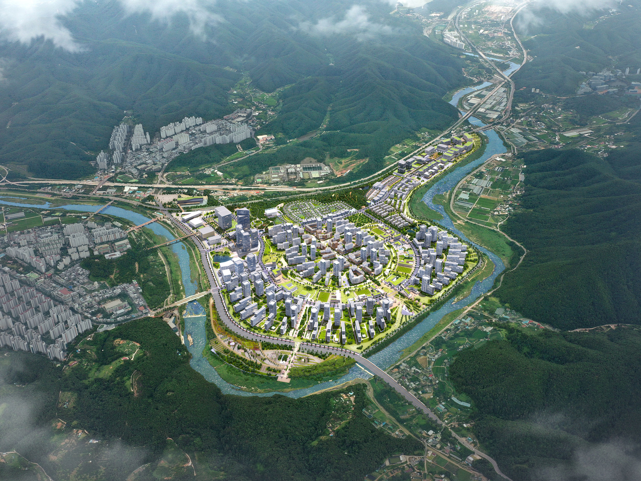 울산선바위지구는 북측으로 태화강이 흐르고 북동측에 선바위라는 관광요소가 특징적인 곳이다. 간선도로에 길게 면해 있는 남측 보존녹지를 구역 전체에 끌어들이면서 태화강의 흐름을 닮은 곡면의 녹지 및 공공시설 공간을 제안, 보다 간결히 공간을 인식하고 공공시설과 학교에 편리하게 접근하며 이용할 수 있는 가능성을 마련했다. 하천에 가까워질수록 낮아지는 건물 배치를 통해 자연과 조화를 이루는 특징적 경관을 지닌 도시로 자리매김하도록 계획했다.