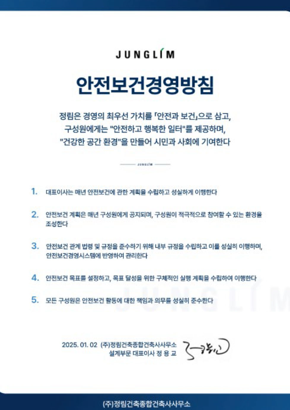 정림건축은 임직원의 안전과 건강을 경영의 최우선 가치로 삼고 있습니다. ISO 45001 국제 표준에 기반한 안전보건경영시스템을 구축·운영하고 있으며, 안전보건경영방침 아래 임직원은 물론 파트너사와 지역사회의 안전까지 고려한 통합적 시스템을 실현하고 있습니다. 정림은 지속가능한 건축을 위해, 오늘도 '안전한내일'을 설계합니다.